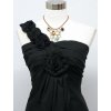 Černé elegantní společenské šaty vhodné pro plnoštíhlé nebo těhotné dámy a slečny. Šaty mají zabičková záda, která udrží šaty hezky na těle a roztáhnou šaty o několik velikostí. V pase mají šaty širokou ozdobnou stuhu, která šaty utáhne na těle a v rámci možností vypasuje. Jedno hezky ozdobené ramínko šaty udrží na těle. Volný pas zakryje bříško, sukně je splývavá, volná. Velká ozdobná kytka na předním díle je odnímatelná na spínací špendlík.