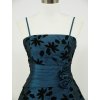 Krátké koktejlové šaty z modrého šustivého taftu s retro černým plyšovým potiskem pro plnoštíhlé dámy a slečny. Široká áčková sukně, pod kterou vejde i krátká spodnička. Tenká ramínka jsou posunovací a jsou nastavitelná a můžete si délku šatů upravit dle své výšky. Na zádech mají šaty tzv. žabičky, které dokážou šaty natáhnout na těle o několik velikostí a v pase široká stuha naopak dokáže šaty vypasovat a zúžit o několik velikostí. Z toho důvodu jsou šaty vhodné pro nákup bez vyzkoušení a budou vám sedět, i když mírně změníte velikost. Vybírejte vždy dle svých rozměrů. Z boku je skrytý zip pro snadné oblékání. Tyto společenské šaty pro plnoštíhlé využijete na plesy, do divadla, na slavnostní večeři, ale hodí se i pro mladé dívky do tanečních. Nemusíte se bát nákupu přes internet. Pokud šaty nebudou sedět, můžete je vyměnit za jinou velikost nebo vrátit.Ramínka jsou posuvná. Pas je zdůrazněn a zdoben květinami. Vzadu jsou gumičky, proto jsou šaty vhodné na dvě velikosti a v pase se dají dotáhnout mašlí nebo uzlem, z boku zip. Sukně šatů je lemována organzou. Tyto krásné šaty se hodí jak na svatbu, tak na ples nebo do tanečních.