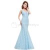 Bleděmodré šaty v oblíbeném střihu mořská panna jsou vhodné pro všechny ženy, které se pyšní štíhlou vysokou postavou a nechtějí být na plese za šedou myšku. Krásný pouzdrový střih s rozšířenou spodní sukní dělá velmi hezkou siluetu. Sukně se rozšiřuje do vlečky, která prodlouží vaši postavu a dodá romantický vzhled. Šaty krásně zdůrazní váš zadeček a opticky zúží v pase. Top šatů je doplněn prsními vycpávkami, pod šaty si tedy nemusíte brát podprsenku. Pokud se přece jen pro podprsenku rozhodnete, ramínka hravě skryjete pod široká ramínka topu. Šaty zdobí hluboký výstřih, který je rafinovaně ukryt za průsvitným tylem. Zapínání na zádech je ukončeno háčkem a očkem, které zabraňuje před nechtěným rozepnutím. Bleděmodrá barva sluší jak brunetkám, tak blondýnkám. Šaty jsou díky svému střihu velmi sexy a skvěle vyzdvihnou vaše ženské zbraně. Hodí se na plesy, do tanečních i pro svědkyni či družičku na svatbu.